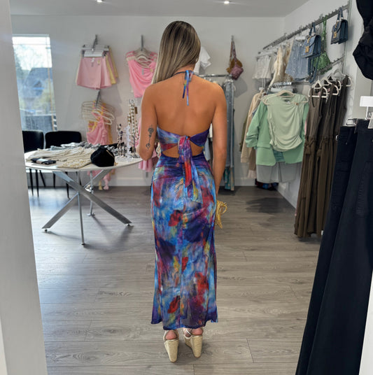 Blue Smudge Print Cowl Neck Midi Dress