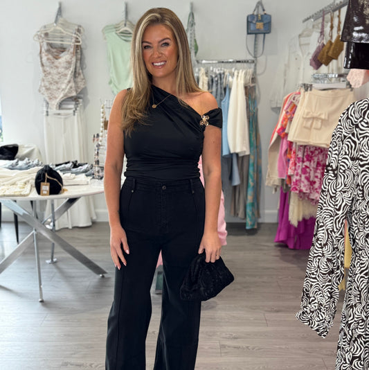 Asymmetric Flower Buckle Top - Black